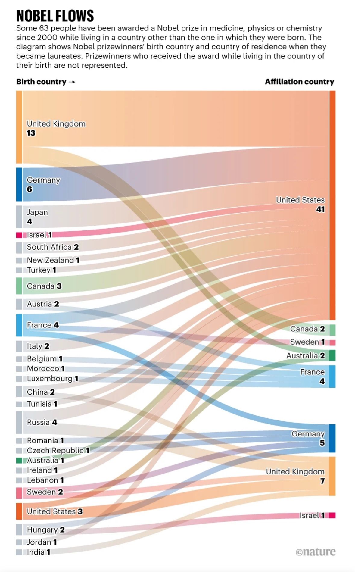 ‘인재 전쟁’이라는 말 들어보셨나요? 특정 분야의 우수 인재를 확보하기 위한 치열한 경쟁을 말하는데요! 과학계에서도 최고의 천재들을 스카우트 하기 위한 숨막히는 전쟁이 펼쳐지고 있습니다. 그 결과가 종합 과학 저널 네이처(Nature)의 ‘노벨 흐름(Nobel Flows)’ 연구를 통해 밝혀졌는데요. 최근 노벨 과학상 수상자의 무려 30%가 이민 과학자였다는 사실, 알고 계셨나요? |