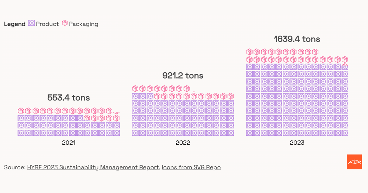 관련하여 소개할 두 번째 시각화는 K-POP 앨범 제작 및 포장에 사용한 플라스틱의 양을 보여주는 와플 차트(Waffle chart)입니다. kontinentalist의 '물리적 현상: CD가 왜 K팝에서 여전히 사랑받는가(The Pysical Phenomenon : Why CDs are still well-loved in Kpop)' 칼럼에 수록된 사례인데요. 보라색 아이콘은 앨범 구성품(제품)을, 분홍색 아이콘은 포장재를 나타냅니다. 하나의 아이콘은 10톤을 의미하는데요! 플라스틱 사용량은 2021년 553.4톤에서 2023년 1,639.4톤으로 2년 만에 약 3배 가까이 양이 증가했음을 알 수 있습니다. 한편, 보라색(제품)의 비중이 분홍색(포장재)보다 압도적으로 큰 것도 눈에 띄어요. 이를 통해 앨범을 감싸고 있는 비닐 같은 포장보다 앨범 내부의 포토북, CD, 랜덤 포토 카드 등 실물 구성품 자체에 플라스틱 사용량이 더 많다는 사실을 알 수 있습니다.