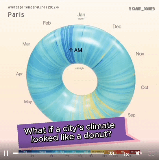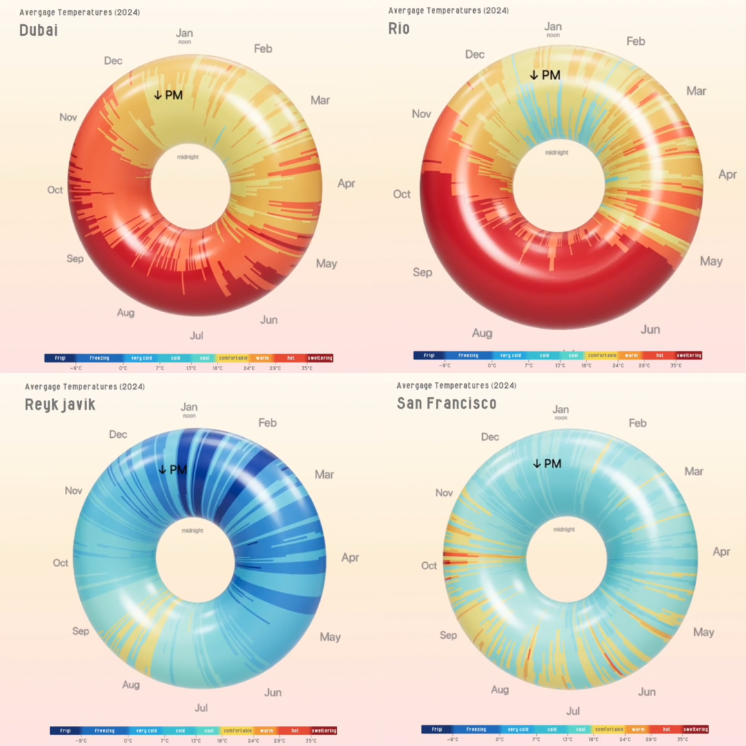해외여행 가기 전에 꼭 체크하는 것, 바로 현지 날씨죠? 1년 내내 따뜻한 두바이나, 1년 내내 추운 아이슬란드처럼 도시마다 날씨의 특징이 너무 다릅니다. 전 세계 도시의 1년 365일 온도를 아주 특별하고 재미있는 방식으로 시각화한 사례가 있습니다. 단순히 데이터를 정확하게 전달하는 것을 넘어, 데이터를 가지고 신나는 시각화 실험을 해본 결과물이라고 하는데요! 함께 자세히 볼까요?