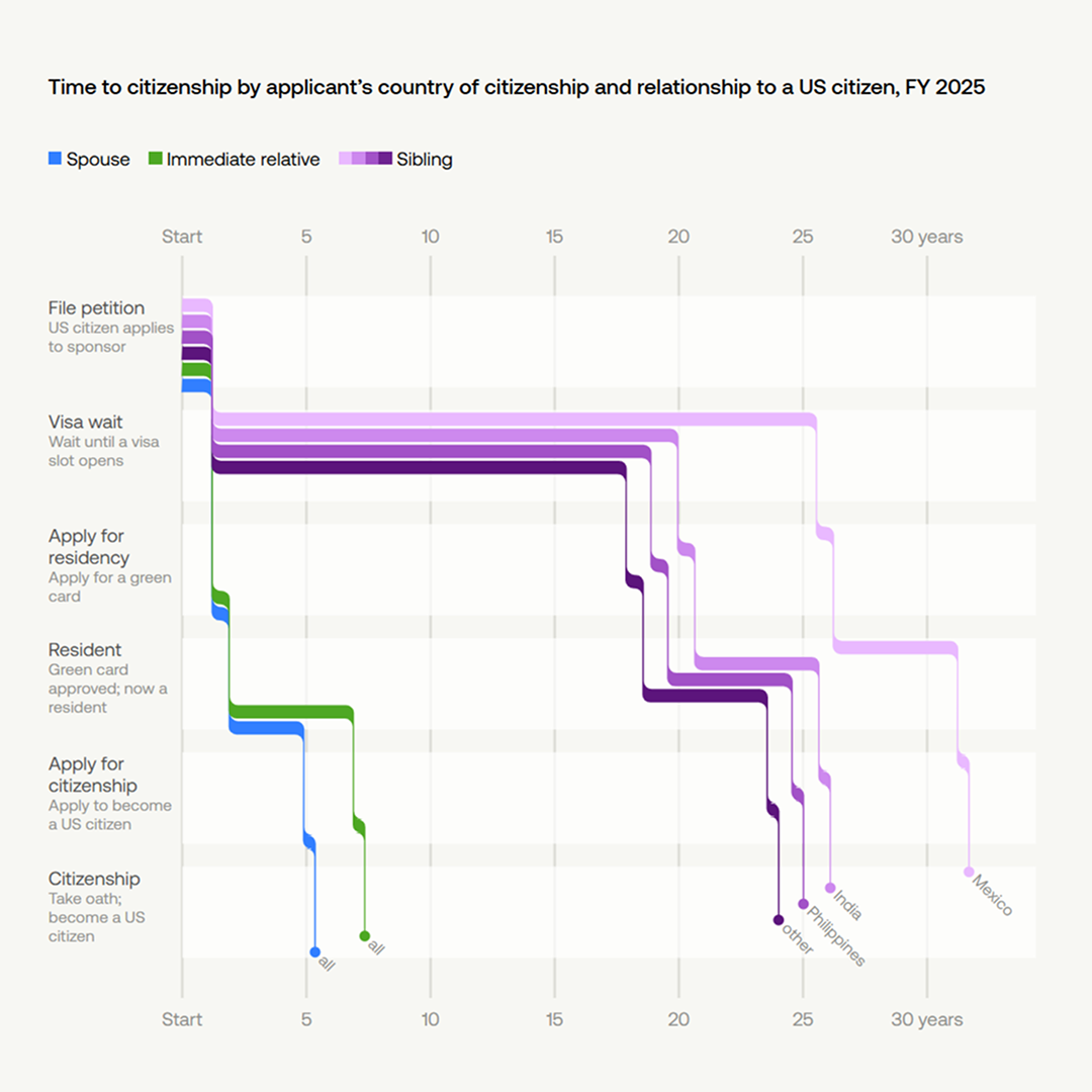 ๊ด๋ จํ์ฌ ์๊ฐํ ์ค๋์ ์ฒซ ๋ฒ์งธ ์๊ฐํ๋ USA Facts์์ ์ ์ํ ๋ฐ์ดํฐ ๋ถ์ ์ปฌ๋ผ, '๋ฏธ๊ตญ ์๋ฏผ์ด ๋๋ ๋ฐ ์ผ๋ง๋ ๊ฑธ๋ฆฌ๋์?(How long can it take to become a US citizen?'์ ์๋ก๋ ์ฌ๋ก์ธ๋ฐ์. ๋ฐ๋ก ๋ฏธ๊ตญ ์๋ฏผ๊ถ ์ทจ๋ ๊ณผ์ ๋จ๊ณ๋ณ ํ์๋ผ์ธ ์ฐจํธ(Timeline chart)์
